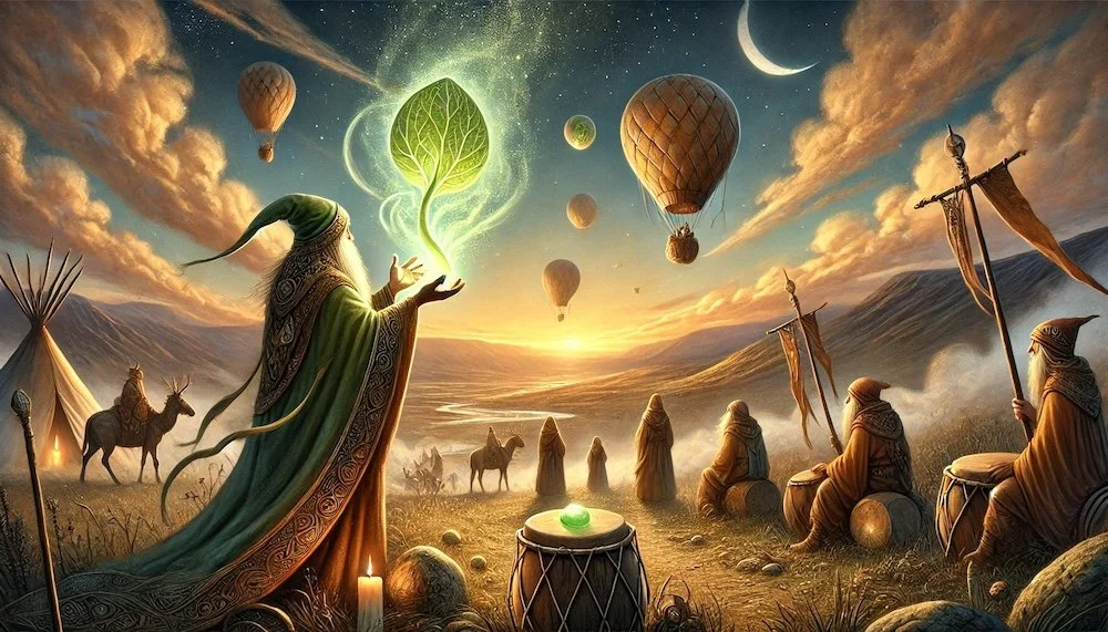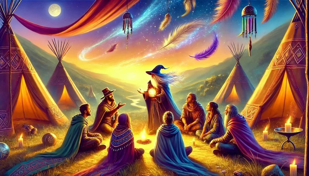 At the foot of one of the highest peaks, I encountered a group of nomadic people who were camping in a sheltered valley. They had long lived on the move, traveling with the winds and following the rhythm of nature wherever it called them. Their camp was a scattering of colorful tents, each one adorned with feathers, chimes, and other symbols of the Air element.