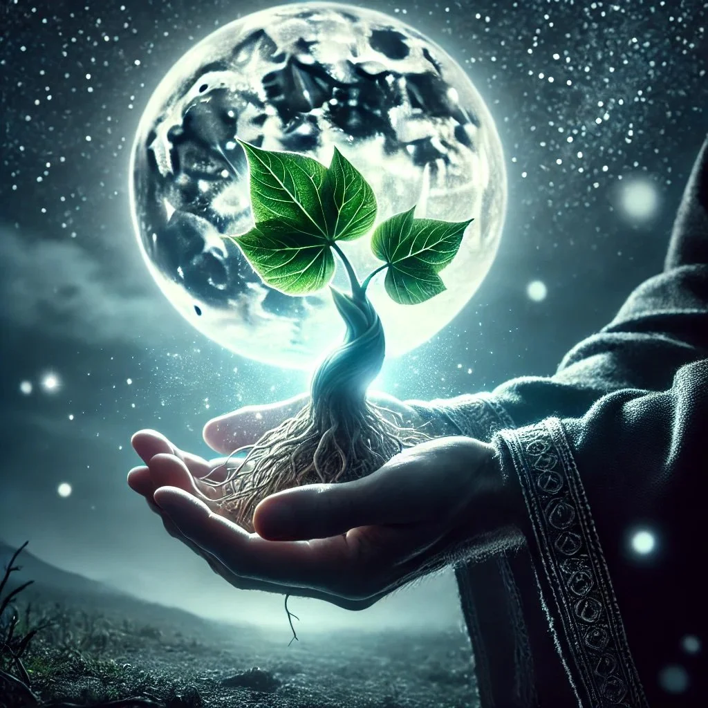 On the night of the Full Moon, I stood outside beneath the vast sky, the air alive with magic. In front of me burned a sacred fire, its flames leaping high into the air, eager to impart their energy. I held the sprout in my hands, its leaves shimmering with a faint light, as if already attuned to the magic of the moon above.