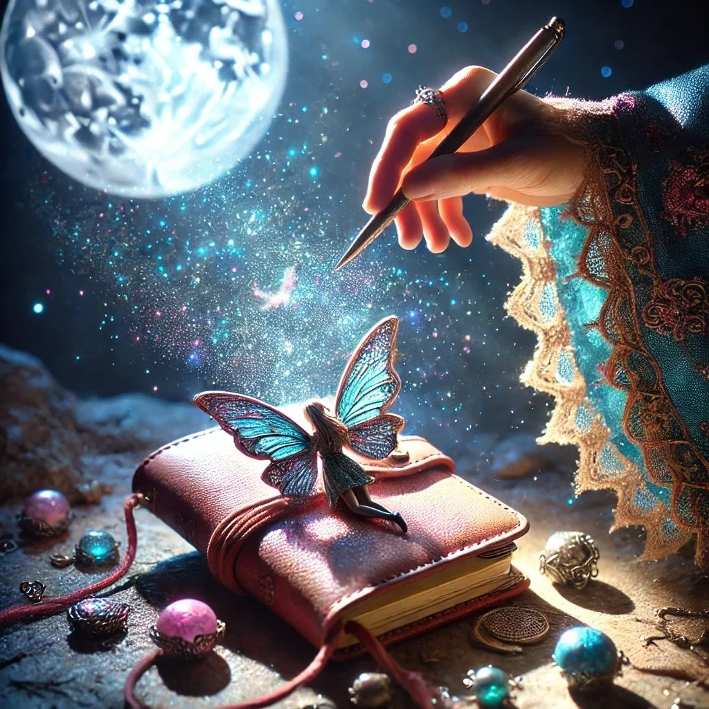 That night, under the light of the moon, I reached into the fey realm and summoned a magical notebook. It was a small thing—pocket-sized and bound in soft, colorful leather, decorated with glitter and paint that shimmered like the wings of a fairy. I attached a pen to the notebook with a cord, ensuring it would always be ready for the next dreamer.