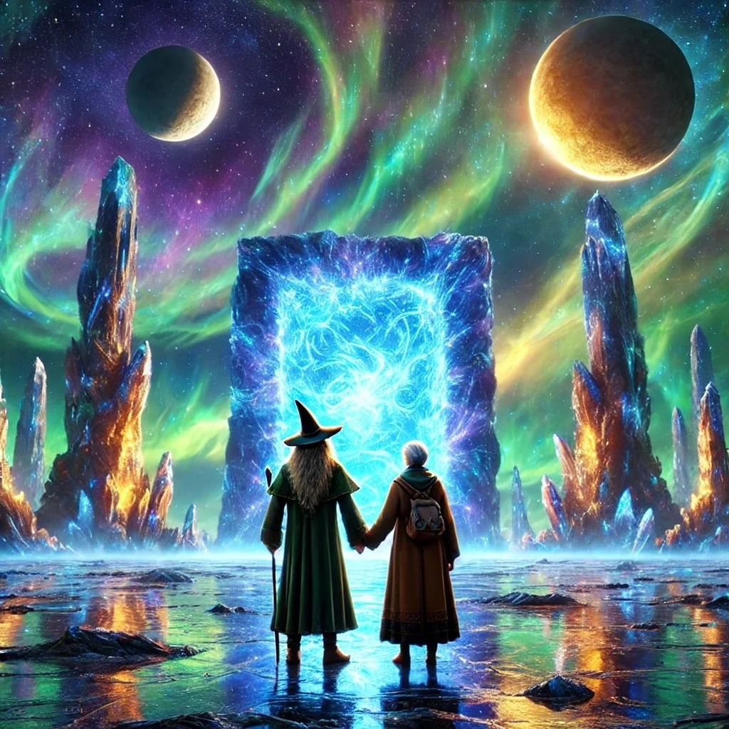 When the light faded, we found ourselves standing not in the familiar fields of Texas, but in a landscape unlike any I'd ever seen. The sky above was a tapestry of swirling colors—indigo, emerald, and gold—illuminated by three moons of varying sizes. The ground beneath our feet was soft and iridescent, shimmering with every step we took.