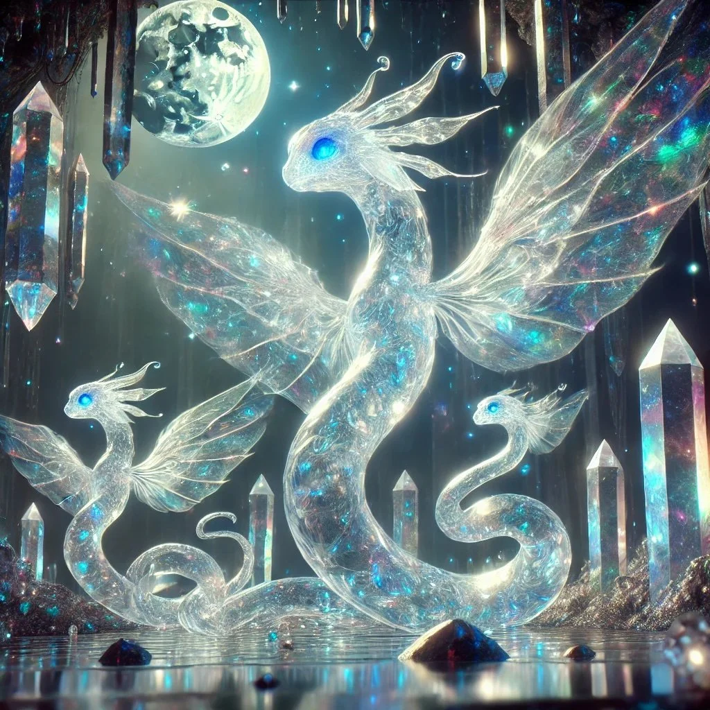 As we entered the labyrinth, the crystals began to vibrate, emitting tones that resonated deep within our bones. The path wound in unexpected ways, and it wasn't long before we realized we were not alone. Ethereal creatures, resembling translucent serpents with wings, slithered around the crystals, their eyes watching us curiously.